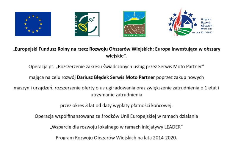 Firma Serwis Moto Partner oferuje usługi mechaniczne w mieście Przasnysz od wielu lat. Od pewnego czasu przedsiębiorstwo prężnie zaangażowało się w świadczenie usług maszynami budowlanymi i ich wynajem. Obszar działania firmy to miejscowości: Przasnysz, Ciechanów, Maków Mazowiecki, Chorzele, Krasnosielc, Jednorożec, Krzynowłoga Mała, Dzierzgowo, Płoniawy-Bramura, Mława, Ostrołęka, Pułtusk, Szczytno, Wielbark, Nidzica, Myszyniec. Główne oferowane usługi to: